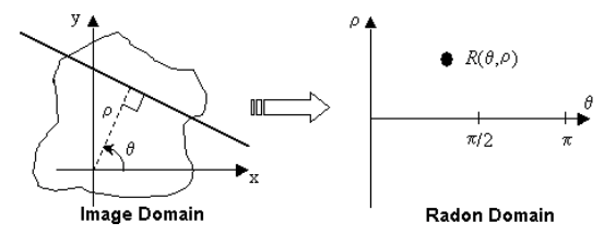 제가 라본 변환의 원리에 관하여 여기서 자세히 설명을 하기는 힘듭니다. 하지만 그냥 기본적인 내용만 언급한다면, 위 그림에서와 같이 2차원 이미지 상의 원점(이미지 내의 한가운데 지점)으로부터 특정한 각도 및 거리만큼 떨어진 위치로 연결되는 선과 수직을 이루는 선을 따라서 이미지의 화소값들을 선적분(Line Integral)한 적분값을 계산하는 것입니다. 선적분이라고 해서 별 대단한 것은 아니고 그냥 선 상의 화소값들을 모두 합친다는 의미입니다. 이러한 선적분을 모든 각도 및 거리들에 대하여 수행하고 그 결과를 위 그림 우측과 같은 라돈 도메인 상에 표시합니다. 위 그림을 보면 라돈 도메인에서는 X축이 각도 값들에 해당되고 Y축이 거리 값들에 해당됩니다. 선적분의 값이 높으면 라돈 도메인에서의 그 좌표값도 높게 나타납니다. 사실 라돈 도메인도 일종의 2차원 공간이므로 가시적으로는 마치 이미지처럼 보이게 되는데, 이 안에서 값이 높은 점(Point)이 된다는 것입니다. 선적분의 값이 크다는 것은 원래의 이미지 상에서 충분한 거리에 걸쳐 나름 높은 값이 유지되는 형체가 있다는 의미가 되며, 이러한 특성을 라돈 변환에 의하여 직접 확인할 수 있다 정도로 이해하면 될 것 같습니다. 만약 라돈 변환에 관한 더 자세한 이론이 궁금하시다면 웹상의 검색 등을 통하여 직접 확인해보실 것을 권장합니다.