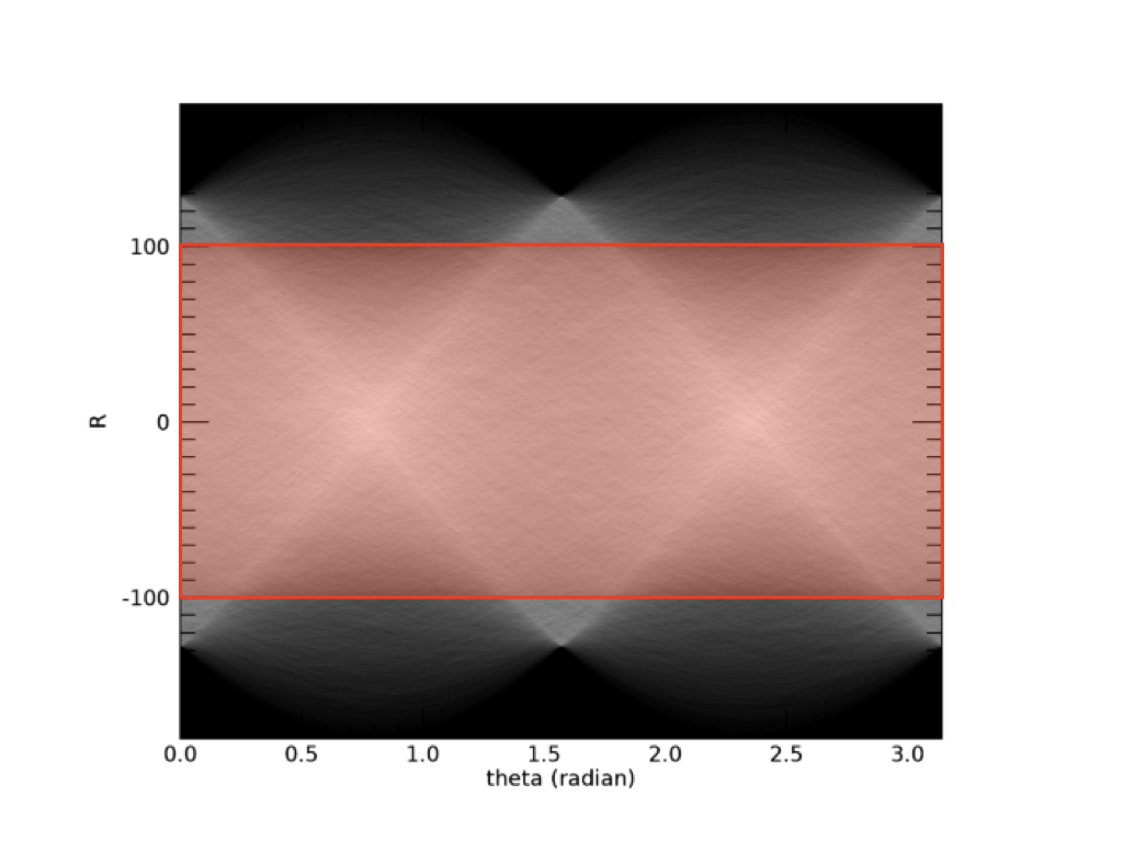 만약 실제로 원본 데이터 상에서 이러한 원형의 형체로 나타나는 부분에 대한 정보를 뽑아내는 것에 주목한다고 하면, 라돈 변환 결과 데이터인 result에서 위의 그림과 같은 붉은색 사각형에 해당되는 부분을 효과적으로 추출하기 위한 뭔가 추가적인 처리를 해주는 것이 필요할 수도 있습니다. 사실 그 방법에는 여러가지가 있을 수 있겠지만, 여기서는 다음과 같이 클리핑(Clipping) 기법을 적용해보기로 하겠습니다.