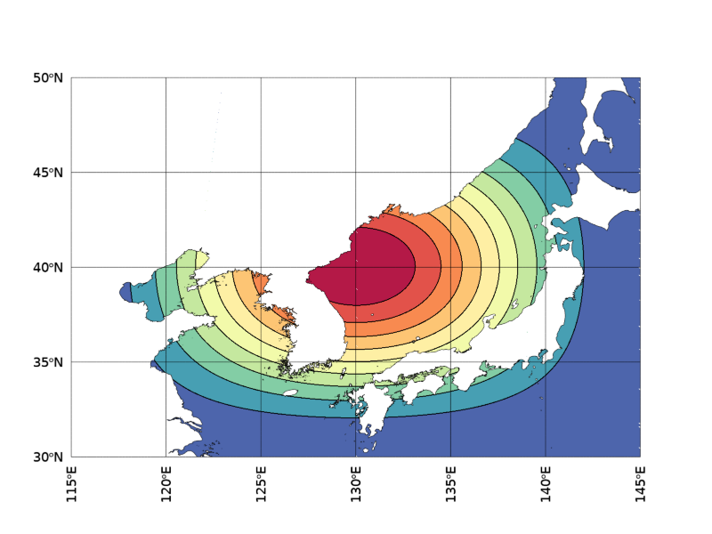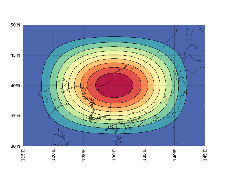 이와 같이 바탕 지도를 표출한 후 가상의 2차원 데이터를 등위선(Contour)의 형태로 중첩하여 표출하는 예제입니다. 다만 여기서는 CONTOUR 함수를 두번에 걸쳐 사용하였는데, 첫번째 등위선인 cn은 색상만 채워진 형태이고 두번째 등위선인 cno는 라인만 표시되는 형태입니다. 표출 결과 그림은 다음과 같습니다.