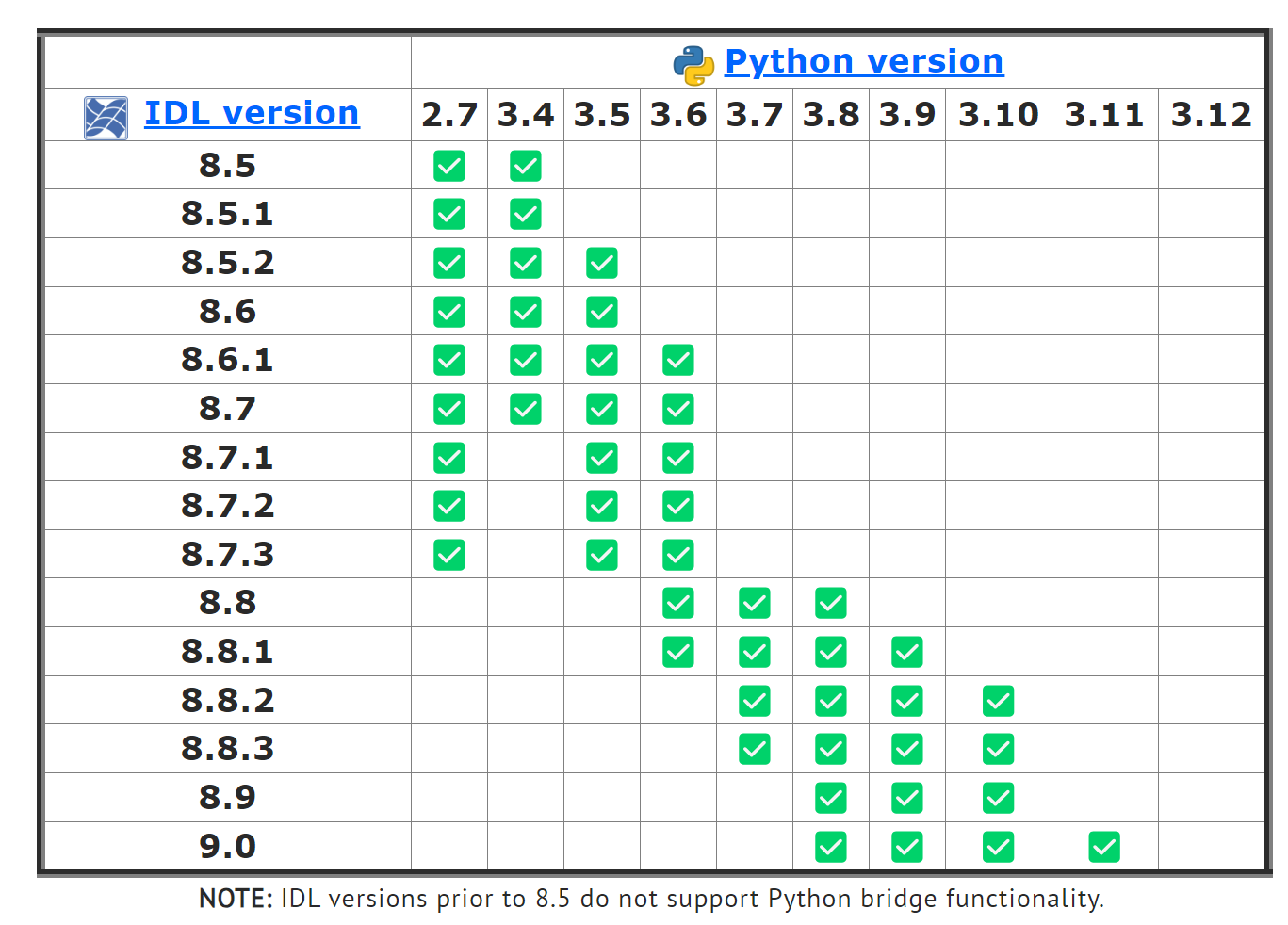 IDL 버전별로 브릿지 기능으로 연동되는 Python 버전 일람