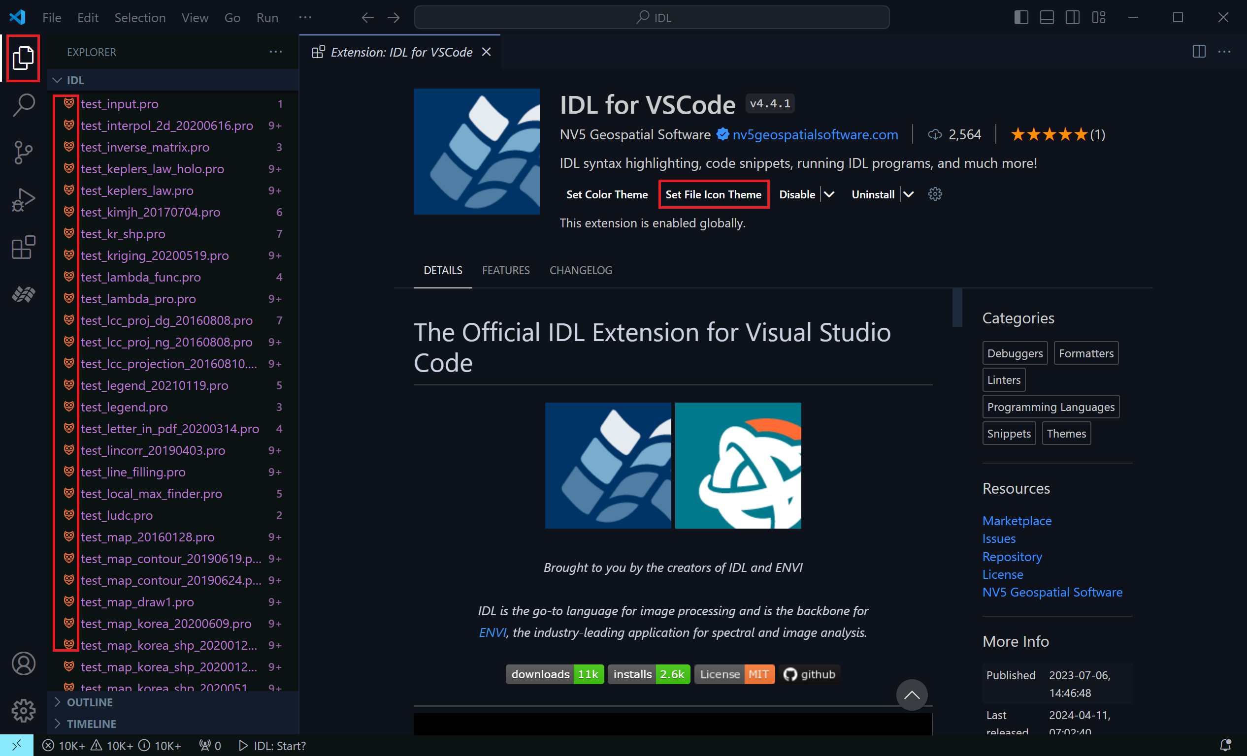 그런데 여기서 파일들의 아이콘을 잘 보면 우리가 일상적으로 보아오던 .pro 파일의 아이콘이 IDL 로고 모양이 아니고 약간 하트 비스무리하면서 생소한 모습인 것이 보입니다. 이것은 IDL for VSCode를 처음 구동했을 때 VSCode 자체의 기본 설정으로 인한 것인데, 아무래도 IDL 유저 입장에서는 이 아이콘을 IDL 로고 모양으로 바꾸는 것이 좋을 것입니다. 이를 위해서는 IDL for VSCode 확장 모듈의 메인 화면에서 Set File Icon Theme 버튼을 누르고 여기서 IDL (Customized Visual Studio Code) 항목을 선택하면 됩니다. 그러면 다음과 같이 우리에게 익숙한 IDL 아이콘 형태로 바뀌게 됩니다.