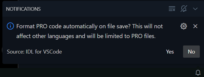 이것은 VSCode 환경에서 작성 및 편집되는 IDL 프로그램의 default formatter를 IDL for VSCode 확장 모듈로 설정하겠느냐고 묻는 것인데, VSCode 환경에 익숙치않은 유저 입장에서는 이런 질문의 의미가 무엇인지 약간 혼란스러울 수도 있습니다. 이것은 VSCode 환경에서 IDL 프로그램을 작성 및 편집할 때 프로그램 문구의 표기 형식을 IDL for VSCode 확장 모듈이 직접 제어하도록 할 것인가를 묻는 것인데요. 이게 IDL 프로그래머 입장에서는 Yes를 선택하기가 좀 꺼려질 수도 있습니다. 왜냐하면 프로그래머 자신만의 스타일로 프로그램의 내용을 작성하는 것을 더 선호한다면 이렇게 내부적으로 표기의 형식이 자동으로 설정되는 것이 별로 달갑지 않을 수도 있기 때문입니다. 물론 프로그래머의 성향에 따라서는 Yes를 선택하는 것을 더 선호할 수도 있습니다. 만약 Yes를 선택하게 될 경우에는 바로 이어서 다음과 같이 .pro 파일을 저장할 때마다 자동으로 형식 지정이 되도록 할 것이냐고 또 물어볼텐데 여기서도 Yes를 선택하면 됩니다.