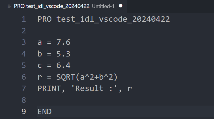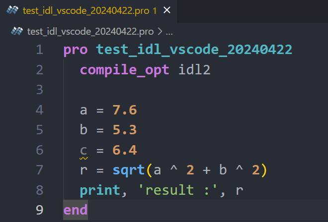 물론 프로그램의 내용 자체는 달라진 것이 아니지만, 프로그램의 내용 문구를 표기하는 형식(Format)이 자동으로 변경된 것입니다. 이것은 앞서 VSCode 환경에서 작성 및 편집되는 IDL 프로그램의 표기 형식을 IDL for VSCode 확장 모듈이 직접 제어하도록 설정해둔 상태이기 때문에 이와 같이 VSCode가 알아서 형식을 제어한 것입니다. 잘 보면 소문자의 표기, 띄어쓰기 등에 대한 설정 뿐 아니라 compile_opt idl2라는 명령이 사용된 것 등이 모두 이러한 변경사항들에 해당됩니다. 그래서 이와 같이 VSCode 환경에서 프로그램 내용 문구의 표기 형식이 자동으로 제어되는 것이 유저 입장에서는 괜찮을 수도 있고 그렇지 않을 수도 있습니다. 만약 유저 나름대로 자신만의 표기 방식을 선호하는 경우에는 이러한 설정이 거추장스럽게 느껴질 것입니다. 다만 여기서는 이후의 설명을 위하여 이렇게 자동 형식 설정 기능이 활성화된 상태로 계속 진행해보겠습니다. 그러면 위와 같이 프로그램 파일(.pro)이 저장된 상태에서 프로그램 내용의 표기 형식이 자동으로 변경된 상태인 것을 편집창에서 확인할 수 있는데요. 그런데 실제로는 대다수의 유저들에게는 위의 편집창의 모습이 다음과 같이 아마 다음과 같이 보일 것입니다.