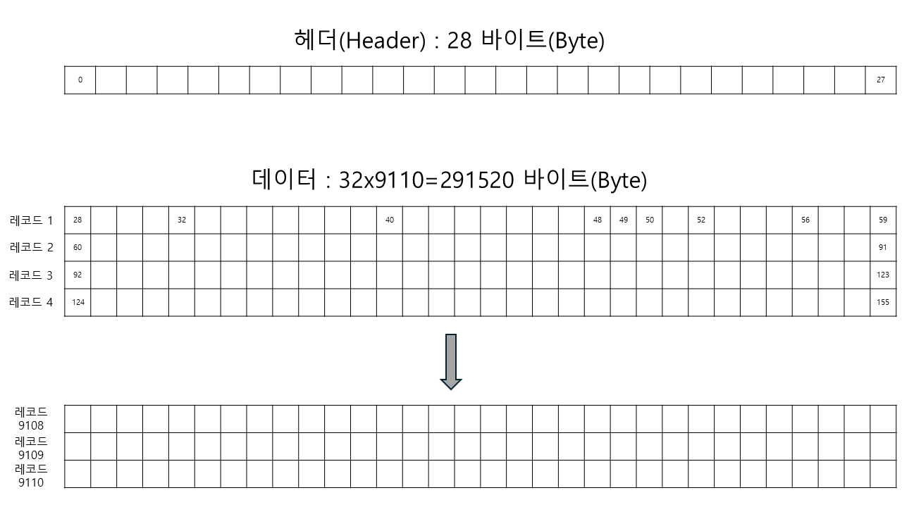 어쨌든 이와 같은 방식으로 첫번째 레코드 32바이트의 내용을 해독하였습니다. 물론 이것은 총 9110개의 레코드들 중 첫번째일 뿐입니다. 두번째 레코드를 읽는 것도 기본적으로는 위와 같은 방식으로 작업하면 됩니다. 다만 여기서 주의할 것은 모든 레코드를 순차적으로 제대로 읽으려면 각 레코드의 바이트 위치를 순서에 맞게 계속 옮겨줘야 한다는 것입니다. 첫번째 레코드가 시작되는 바이트 위치가 28임을 앞서 언급한 바 있습니다. 그리고 각 레코드의 크기는 32바이트입니다. 그러면 두번째 레코드의 시작 위치는 28+32=60이 될 것임을 알 수 있습니다. 이런 식으로 따지면 세번째 레코드의 시작 위치는 28+32+32=92, 네번째 레코드는 28+32+32+32=124, 다섯번째 레코드는 28+32+32+32+32=156 등과 같이 될 것입니다. 따라서 9110개의 모든 레코드들에 대한 데이터를 읽으려면, 각각의 레코드를 읽는 작업을 총 9110회에 걸쳐서 위치를 옮겨가면서 반복적으로 수행해야 합니다. 그리고 궁극적으로는 이러한 과정을 통하여 레코드를 구성하는 항목들 각각에 대한 배열을 얻는 것이 중요한 목표가 될 것입니다.