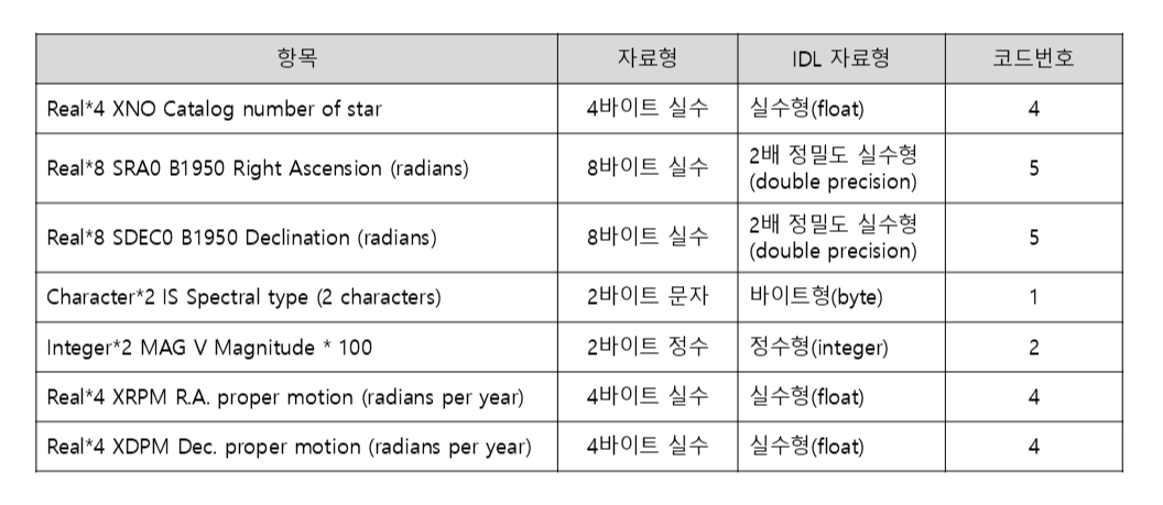 이와 같이 카탈로그상의 일련번호, RA, Dec, Spectral Type, V 등급 등 총 7종의 값들로 구성되어 있으며 각각의 값마다 점유하는 바이트수는 4, 8, 8, 2, 2, 4, 4입니다. 이 바이트수를 모두 합치면 32가 됩니다. 그리고 각 항목마다 자료형이 서로 다른데 Real*4는 4바이트 실수, Real*8은 8바이트 실수, Integer*2는 2바이트 정수에 해당됩니다. 따라서 이러한 자료형 및 바이트수의 특성을 고려하여 값을 읽어들여야 합니다. 여기서 4바이트 실수는 IDL에서는 일반 실수형에 대응되고, 8바이트 실수는 2배 정밀도 실수형, 2바이트 정수는 일반 정수형에 대응됩니다. 결국 매 회차마다 읽어들이는 32바이트 크기의 레코드로부터 개별 데이터 값을 해당 자료형에 맞춰서 추출하는 작업을 정의하는 것이 가장 중요합니다.