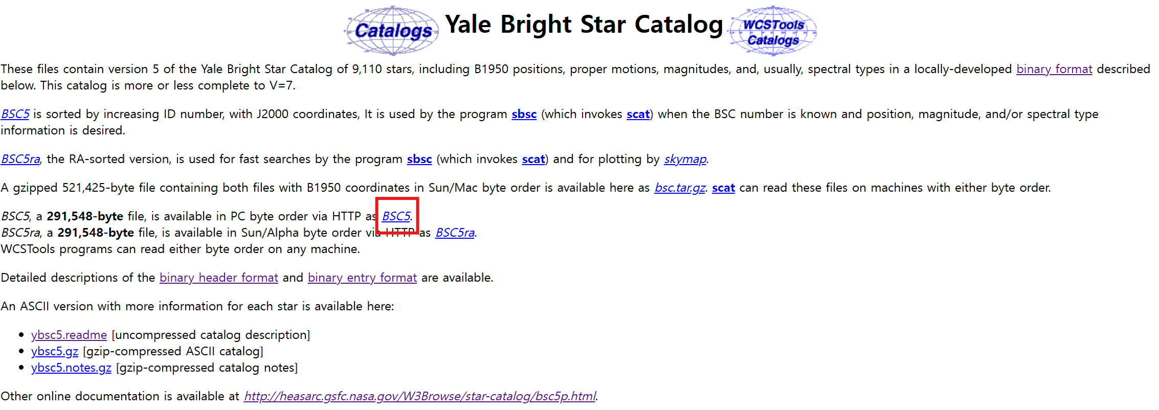즉 위에 표시된 링크 버튼을 누르면 'BSC5'라는 이름(확장자는 없습니다)의 바이너리 파일을 내려받게 됩니다. 관련 설명에 의하면 이 파일의 크기는 291548 바이트(Byte)라고 명시되어 있으며, 실제로 이 파일 내에는 예일 밝은 별 별 목록 데이터가 291548 바이트만큼 수록되어 있습니다. 일단 이 파일은 여기에도 첨부해놓겠습니다.