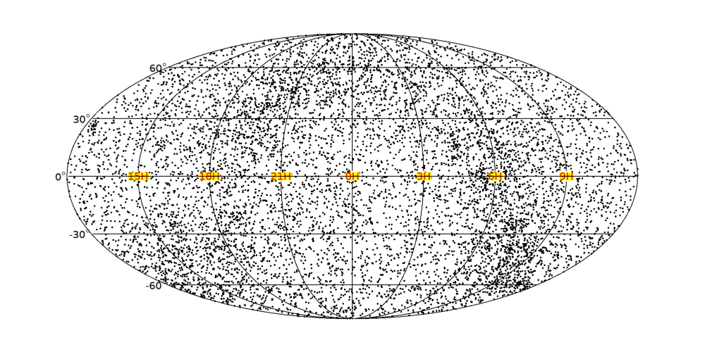 이 내용을 보면 전체 9110개의 데이터 중 정상적인 경우들을 실제로는 9096개인 것으로 확인됩니다. 즉 14개는 비정상적인 경우에 해당된다는 의미입니다. 따라서 이와 같이 정상적인 값들로만 구성되도록 필터링된 배열 데이터를 사용하여 이후의 과정으로 진행하면 됩니다. 그러면 본격적으로 표출 과정으로 가봅시다. 9096개의 모든 별들이 표시된 지도를 표출하기 위해서는 그래픽창을 띄우고 바탕지도를 표시해야 합니다. 지도를 표시하는 방식은 여러가지가 있겠지만, 여기서는 데이터의 특성을 고려하여 Mollweide 투영법의 지도를 사용해보겠습니다. 이 과정은 다음과 같이 처리합니다.