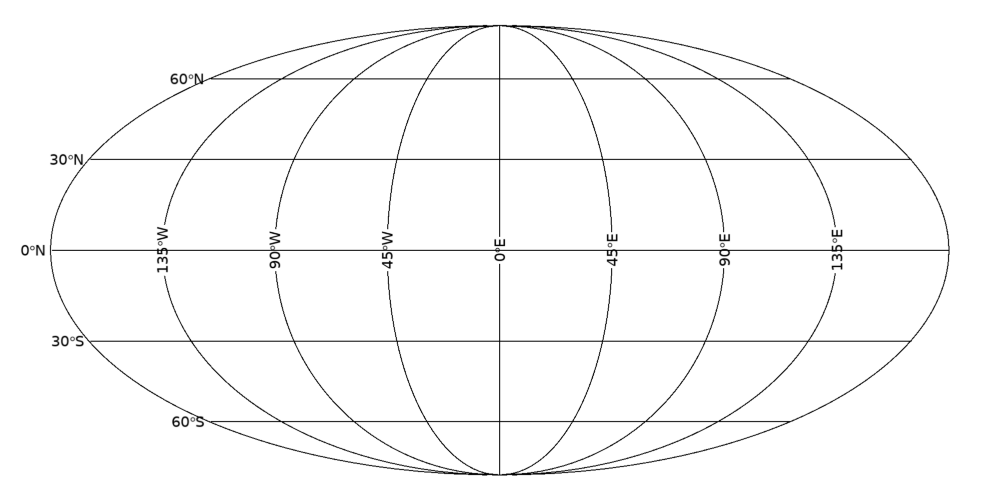 이와 같이 MAP 함수에서 투영법을 'Mollweide'로 지정하면 됩니다. 그리고 지도의 특성상 위도에 해당되는 라벨 문자들이 바깥쪽에 위치하도록 하였습니다. 표출된 그림을 보면 다음과 같습니다.
