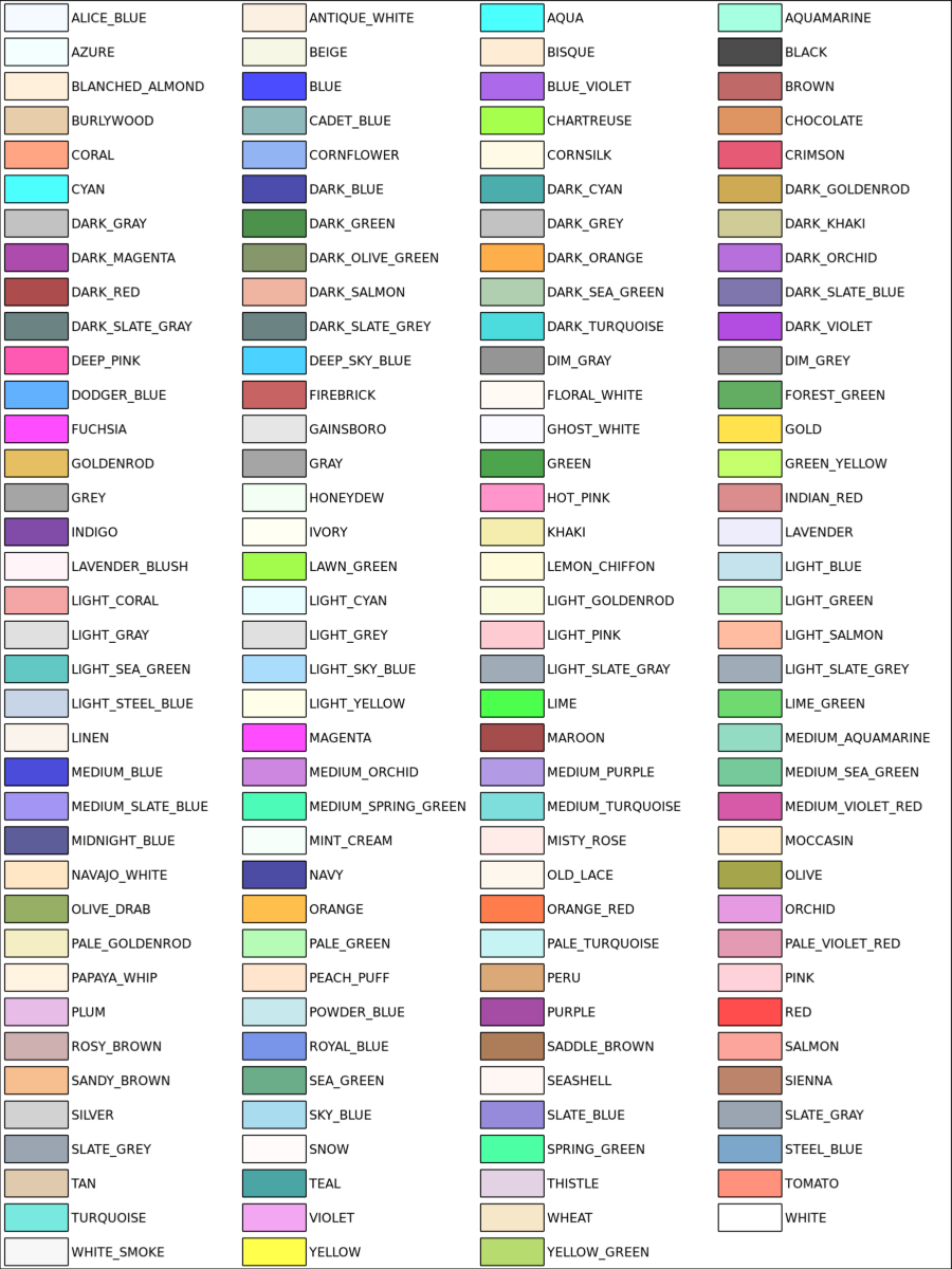 그리고 위의 그림에서 컬러의 명칭에 해당되는 문자들을 보면 명칭 자체가 여러 단어들로 구성되어 있어서 중간중간에 언더바(_)가 있는 경우들이 있습니다. 예를 들면 'DEEP_PINK', 'LIGHT_SKY_BLUE' 등이 그러한 경우에 속합니다. 다만 이러한 명칭들을 실제로 사용할 때에는 언더바를 그대로 적어도 되고 아니면 그냥 빈 칸으로 띄어쓰기를 해도 됩니다. 즉 다음과 같은 두가지 방식 모두 유효합니다.