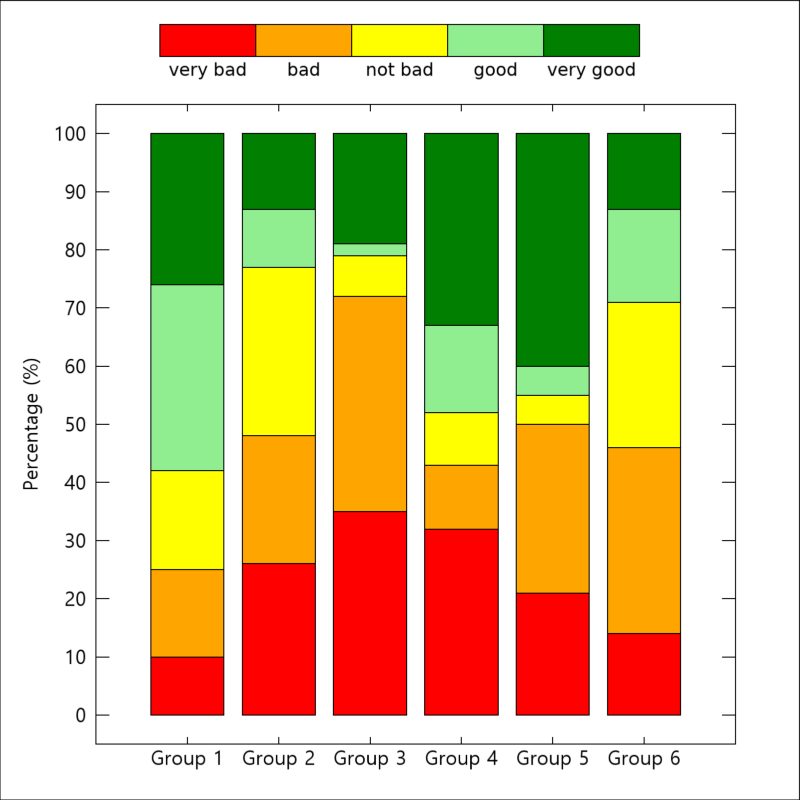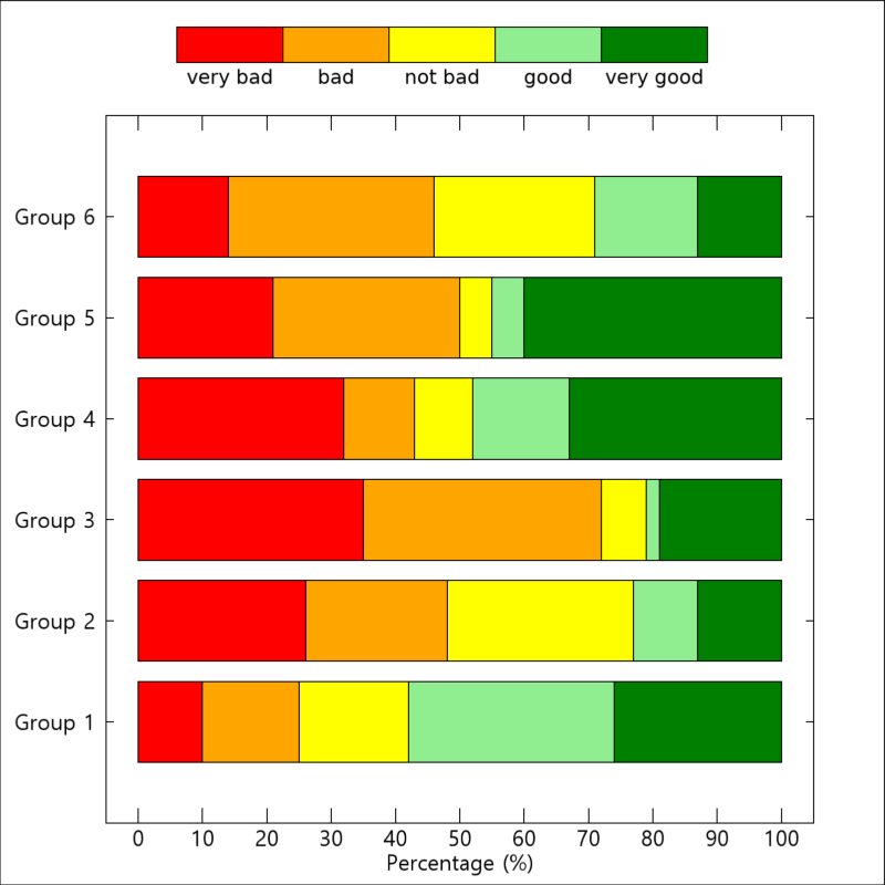 여기서는 6개의 집단들을 대상으로 5종의 카테고리로 답변을 하도록 하여 각 카테고리별로 응답률(%) 값을 얻은 것으로 가정하였습니다. 그리고 응답률에 해당되는 값들로 구성된 배열 data는 위와 같이 5x6의 2차원 구조를 갖도록 정의하였습니다. 그 외에 cats는 각 카테고리별 명칭, colors는 각 카테고리별 색상, gnames는 각 집단별 명칭에 해당됩니다.