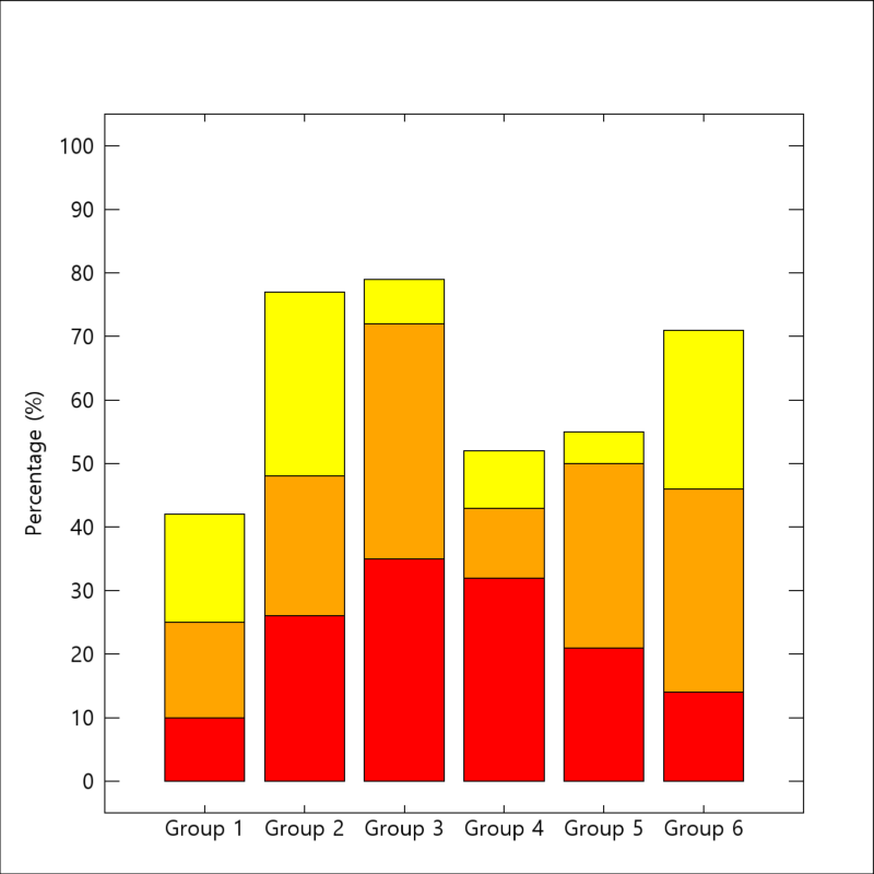 이 그림에서는 어떤 설문 조사를 6개의 집단들을 대상으로 실시하고 각 카테고리별 응답 비율을 막대 차트의 형태로 표시하고 있습니다. 오늘은 이러한 막대 차트(Bar Chart) 그림을 IDL에서 표출하는 방법을 소개해보고자 합니다. 위의 그림은 당연히 IDL로 표출한 것이며 그 과정을 지금부터 살펴보겠습니다. 먼저 예제 데이터부터 정의해봅시다. 그 과정은 다음과 같습니다.